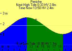 Peniche Lisbon, Portugal + Corrections: High(-0:18 -2.00) Low(+0:08 -0.40) Units are meters Mark level: 0.00 Tuesday 2023-06-13 Sunrise 6:10 HV, Sunset 21:05 HV Moonrise 3:08 HV, Moonset 16:30 HV Low Tide: 6:08 HV 1.0 High Tide: 12:11 HV 2.6 Low Tide: 18:30 HV 1.1 Wednesday 2023-06-14 Sunrise 6:10 HV, Sunset 21:05 HV Moonrise 3:33 HV, Moonset 17:38 HV High Tide: 0:33 HV 2.8 Low Tide: 6:59 HV 0.9 High Tide: 13:08 HV 2.8 Low Tide: 19:22 HV 1.0 Thursday 2023-06-15 Sunrise 6:10 HV, Sunset 21:05 HV Moonrise 4:01 HV, Moonset 18:46 HV High Tide: 1:30 HV 2.8 Low Tide: 7:44 HV 0.9 High Tide: 13:58 HV 2.9 Low Tide: 20:08 HV 0.9 Friday 2023-06-16 Sunrise 6:10 HV, Sunset 21:06 HV Moonrise 4:33 HV, Moonset 19:53 HV High Tide: 2:20 HV 2.8 Low Tide: 8:24 HV 0.8 High Tide: 14:43 HV 3.0 Low Tide: 20:51 HV 0.8 Saturday 2023-06-17 Sunrise 6:10 HV, Sunset 21:06 HV Moonrise 5:11 HV, Moonset 20:57 HV High Tide: 3:06 HV 2.8 Low Tide: 9:02 HV 0.8 High Tide: 15:24 HV 3.0 Low Tide: 21:30 HV 0.8 Sunday 2023-06-18 New Moon Sunrise 6:10 HV, Sunset 21:06 HV Moonrise 5:57 HV, Moonset 21:54 HV High Tide: 3:48 HV 2.8 Low Tide: 9:38 HV 0.8 High Tide: 16:04 HV 3.0 Low Tide: 22:07 HV 0.8 Monday 2023-06-19 Sunrise 6:10 HV, Sunset 21:07 HV Moonrise 6:50 HV, Moonset 22:44 HV High Tide: 4:28 HV 2.8 Low Tide: 10:14 HV 0.9 High Tide: 16:42 HV 3.0 Low Tide: 22:44 HV 0.8 Tuesday 2023-06-20 Sunrise 6:10 HV, Sunset 21:07 HV Moonrise 7:48 HV, Moonset 23:25 HV High Tide: 5:07 HV 2.7 Low Tide: 10:50 HV 0.9 High Tide: 17:20 HV 3.0 Low Tide: 23:21 HV 0.8 Wednesday 2023-06-21 Sunrise 6:10 HV, Sunset 21:07 HV Moonrise 8:49 HV, Moonset 23:59 HV High Tide: 5:45 HV 2.6 Low Tide: 11:27 HV 1.0 High Tide: 17:58 HV 2.9 Thursday 2023-06-22 Sunrise 6:10 HV, Sunset 21:07 HV Moonrise 9:51 HV, Moonset 0:28 HV Low Tide: 0:00 HV 0.9 High Tide: 6:24 HV 2.6 Low Tide: 12:06 HV 1.1 High Tide: 18:37 HV 2.8 Friday 2023-06-23 Sunrise 6:11 HV, Sunset 21:08 HV Moonset 0:28 HV, Moonrise 10:52 HV Low Tide: 0:41 HV 1.0 High Tide: 7:04 HV 2.5 Low Tide: 12:48 HV 1.1 High Tide: 19:18 HV 2.7 Saturday 2023-06-24 Sunrise 6:11 HV, Sunset 21:08 HV Moonset 0:52 HV, Moonrise 11:52 HV Low Tide: 1:26 HV 1.1 High Tide: 7:46 HV 2.4 Low Tide: 13:34 HV 1.2 High Tide: 20:01 HV 2.6 Sunday 2023-06-25 Sunrise 6:11 HV, Sunset 21:08 HV Moonset 1:14 HV, Moonrise 12:52 HV Low Tide: 2:16 HV 1.2 High Tide: 8:32 HV 2.3 Low Tide: 14:28 HV 1.3 High Tide: 20:47 HV 2.5 Monday 2023-06-26 First Quarter Moon Sunrise 6:12 HV, Sunset 21:08 HV Moonset 1:35 HV, Moonrise 13:52 HV Low Tide: 3:13 HV 1.3 High Tide: 9:22 HV 2.3 Low Tide: 15:30 HV 1.4 High Tide: 21:40 HV 2.4 Tuesday 2023-06-27 Sunrise 6:12 HV, Sunset 21:08 HV Moonset 1:55 HV, Moonrise 14:53 HV Low Tide: 4:15 HV 1.3 High Tide: 10:19 HV 2.3 Low Tide: 16:37 HV 1.4 High Tide: 22:39 HV 2.4 Wednesday 2023-06-28 Sunrise 6:12 HV, Sunset 21:08 HV Moonset 2:18 HV, Moonrise 15:58 HV Low Tide: 5:16 HV 1.2 High Tide: 11:20 HV 2.4 Low Tide: 17:41 HV 1.3 High Tide: 23:42 HV 2.4 Thursday 2023-06-29 Sunrise 6:13 HV, Sunset 21:08 HV Moonset 2:43 HV, Moonrise 17:07 HV Low Tide: 6:11 HV 1.1 High Tide: 12:21 HV 2.5 Low Tide: 18:38 HV 1.1 Friday 2023-06-30 Sunrise 6:13 HV, Sunset 21:08 HV Moonset 3:13 HV, Moonrise 18:20 HV High Tide: 0:45 HV 2.5 Low Tide: 7:03 HV 1.0 High Tide: 13:17 HV 2.7 Low Tide: 19:31 HV 0.9 Saturday 2023-07-01 Sunrise 6:14 HV, Sunset 21:08 HV Moonset 3:51 HV, Moonrise 19:34 HV High Tide: 1:43 HV 2.7 Low Tide: 7:51 HV 0.8 High Tide: 14:09 HV 2.8 Low Tide: 20:20 HV 0.7 Sunday 2023-07-02 Sunrise 6:14 HV, Sunset 21:08 HV Moonset 4:40 HV, Moonrise 20:45 HV High Tide: 2:36 HV 2.8 Low Tide: 8:38 HV 0.7 High Tide: 14:58 HV 3.0 Low Tide: 21:08 HV 0.6 Monday 2023-07-03 Full Moon Sunrise 6:15 HV, Sunset 21:07 HV Moonset 5:41 HV, Moonrise 21:48 HV High Tide: 3:26 HV 2.9 Low Tide: 9:25 HV 0.6 High Tide: 15:45 HV 3.2 Low Tide: 21:56 HV 0.4